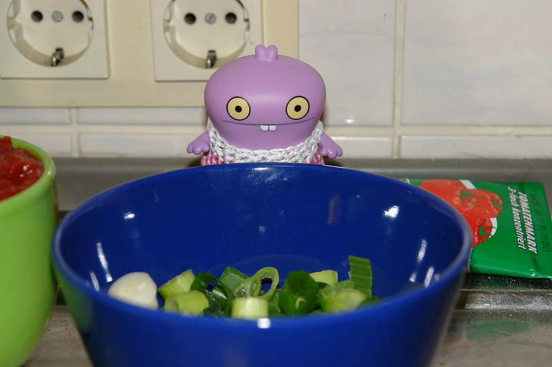 After all the dough for making the pizza base was gone Babo needed a new task to keep her busy, so when we mentioned that the spring onions needed chopped up she got right down to business.