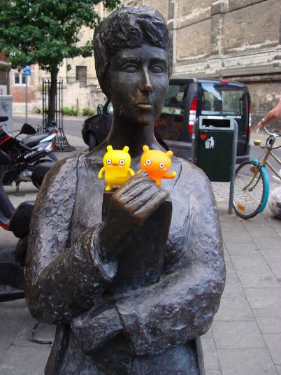 Wage and Jeero liked to ask lots of questions about the many statues which are to be found in the Belgian city of Leuven, so when we found the statue of "woman with book" the pair jumped up onto the book to get their picture taken with her.