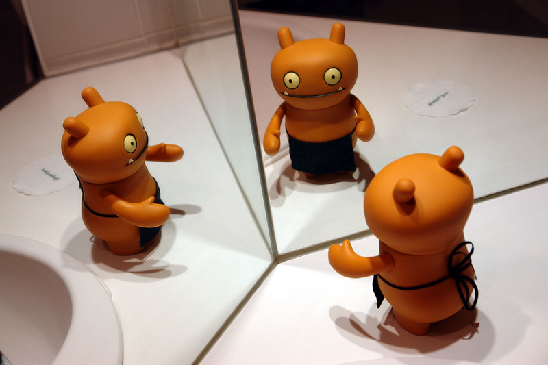 I eventually gave in after about 15mins and found him standing here looking at himself in 2 of the mirrors of the bathroom, every so often trying to move quickly one way or the other to see if he could beat his reflection.