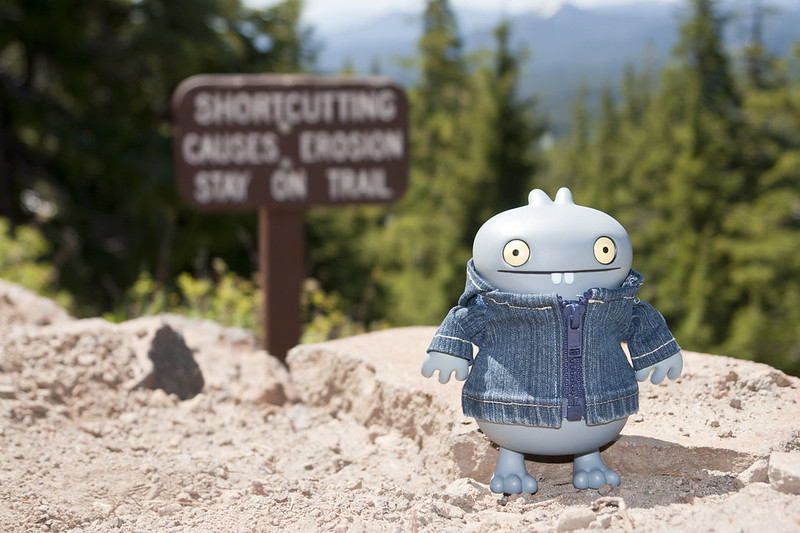As we was climbering ups to the topper of Garfield Peak at Craters Laker I spotteds some peoples cuttering off of the trailer, somethings that I has a biggers problemer with as they is basicallies ruinering the naturals beauties for the futures genemarations.