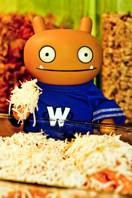 Talkerings of cookering, that word is so closers to cookies that I thinks I had betters have myself a littlers snackeroonie cookie to keeps me going untils the cheesy toppereds tastiersness is readies.