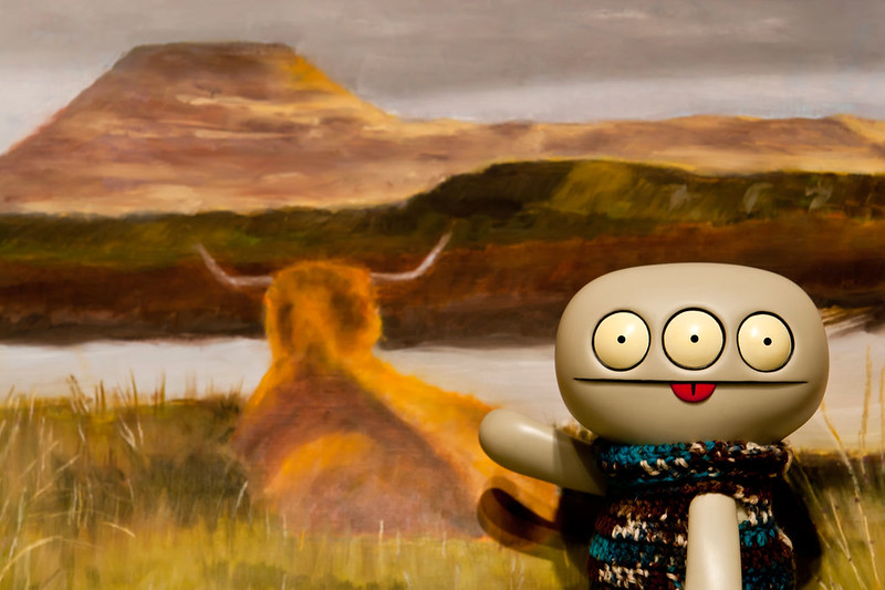 Lasts May Wage findereds a super coolers Heelan Coo while on his holimadays on the Isle of Skye and makers Baz takes a coolers photomagraph of it lyings in the grass starings out towards the tablers of MacLeod.