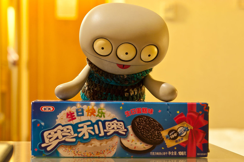 Sures enough she sortereds me out with a packeter of her favouriters cookies. Checkers these badboys out, they is Chineses Oreos with what lookers like birthday cakers fillerings. Oh my goodnessers, I can hardlies containers my excitementers, comes to uncle Cinko my littler beauties!